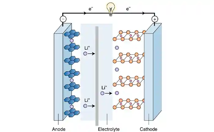 در زمان تخلیه (Discharge)، الکترونها از آند آزاد شده و از طریق مدار خارجی به سمت کاتد حرکت میکنند، در حالی که یونها از طریق الکترولیت درون سلول جابهجا میشوند.