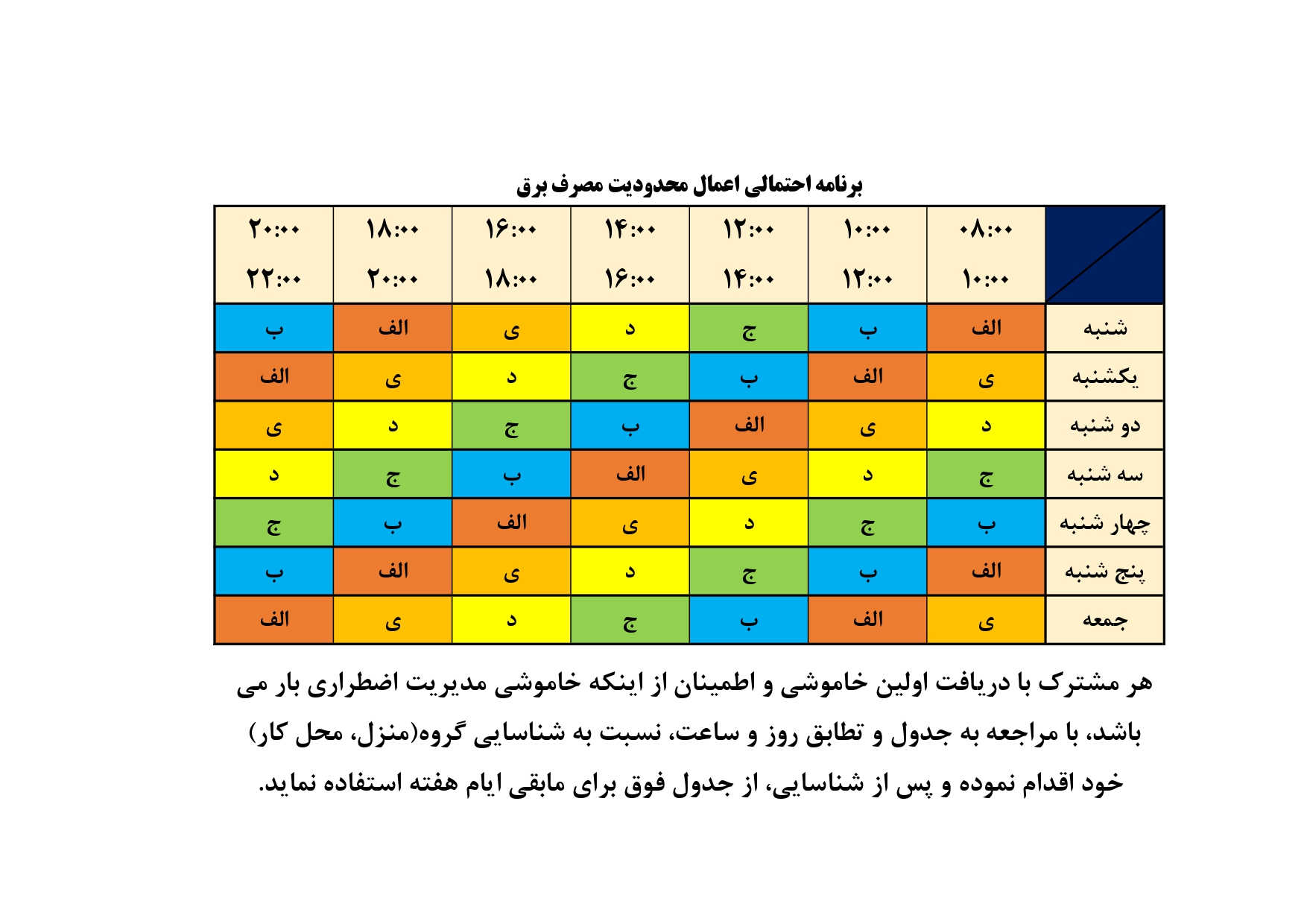 اگر این روش جواب نداد از جدولی که در زیر برای شما آماده کرده ایم طبق این استفاده کنید با اولین خاموشی گروه بندی خود را طبق حرف خود حفظ کنید و خاموشی آینده خود را طبق جدول پیدا کنید: