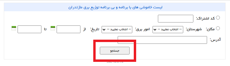 بازدید از وبسایت رسمی شرکت برق مازندران امکان مشاهده جدول کامل قطعی برق و اطلاعیههای جدید را فراهم میکند. کافیست ابتدا وارد سایت شده و گزینه “اطلاعات خاموشی” را انتخاب کنید. در صفحه باز شده اطلاعات لازم را وارد کرده و کلید “جستجو” را بزنید.