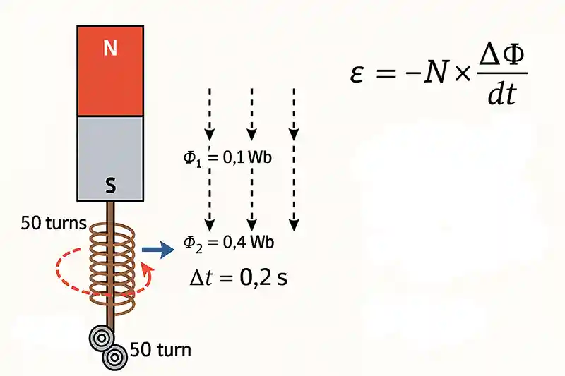 فرض کن یه سیم‌پیچ ۵۰ دور داریم، و شار مغناطیسی از ۰.۱ وبر به ۰.۴ وبر در ۰.۲ ثانیه تغییر کنه.