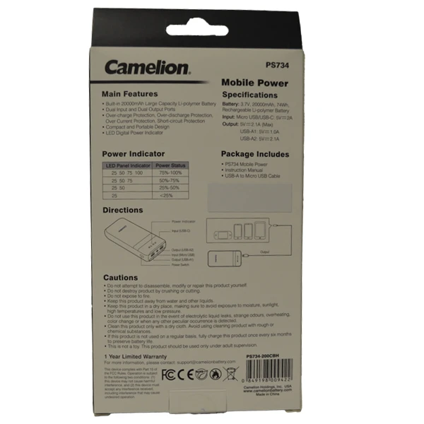باتری: ۳.۷V ۲۰۰۰۰ میلیآمپر ساعت ۷۴ واتساعت، باتری لیتیوم-پلیمر ورودی: Micro USB / USB-C: ۵V، ۲A خروجی: ۵V، ۲.۱A (حداکثر) USB-A۱: ۵V، ۱.۰A USB-A۲: ۵V، ۲.۱A زمان شارژ: حدود ۹ ساعت