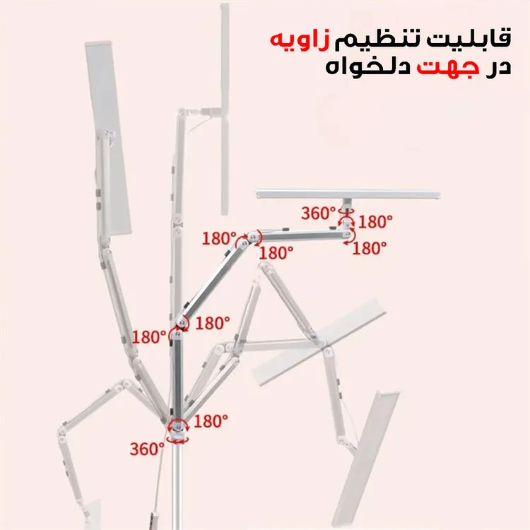 • این چراغ با طراحی مهندسی‌شده و بازوهای آلومینیومی مقاوم، قابلیت تنظیم زاویه و ارتفاع را در چند جهت فراهم می‌کند.